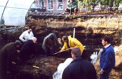 Ungeachtet aller Vorsichtsmaßnahmen hat der Erdblock beim Anschieben der Stahlplatte einen deutlichen Riß bekommen, weil steinharte Schlackeeinlagerungen dem Schub entgegenwirken.