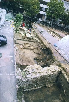 Reste der zu jener Zeit entstandenen Bebauung, im Vordergrund die Stadtmauer.