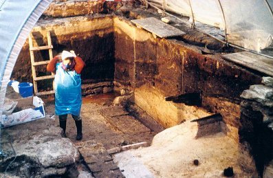Das sandige Material muß gefestigt werden, indem es mit Epoxidharz besprüht wird. Vor dem extrem klebrigen Material müssen Atemwege und Kleidung geschützt werden.